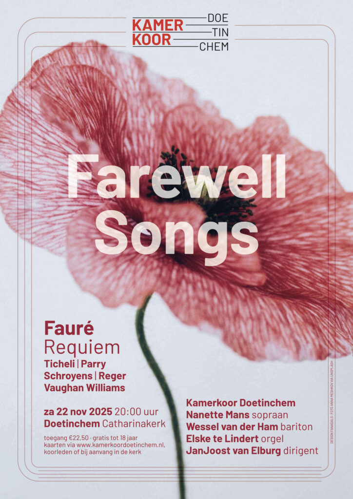 Op zaterdagavond 22 november a.s. zal Kamerkoor Doetinchem een concert uitvoeren getiteld ‘Farewell Songs’ . Het concert vindt plaats in de Catharinakerk Doetinchem en medewerking wordt verleend door Nanette Mans (sopraan), Wessel van der Ham (bariton) en Elske te Lindert (orgel).